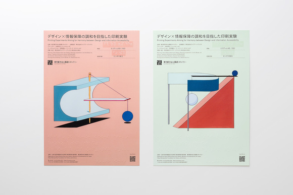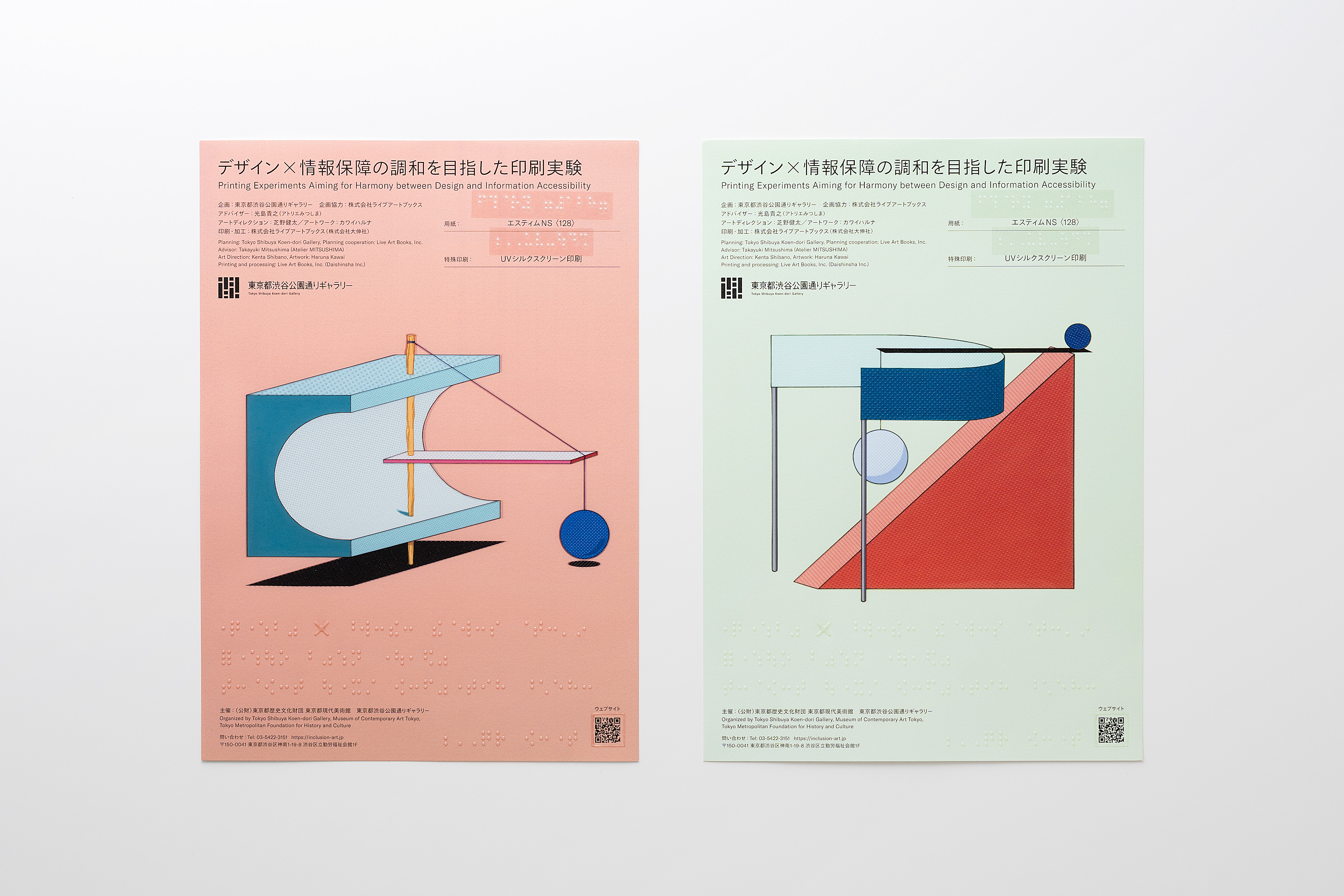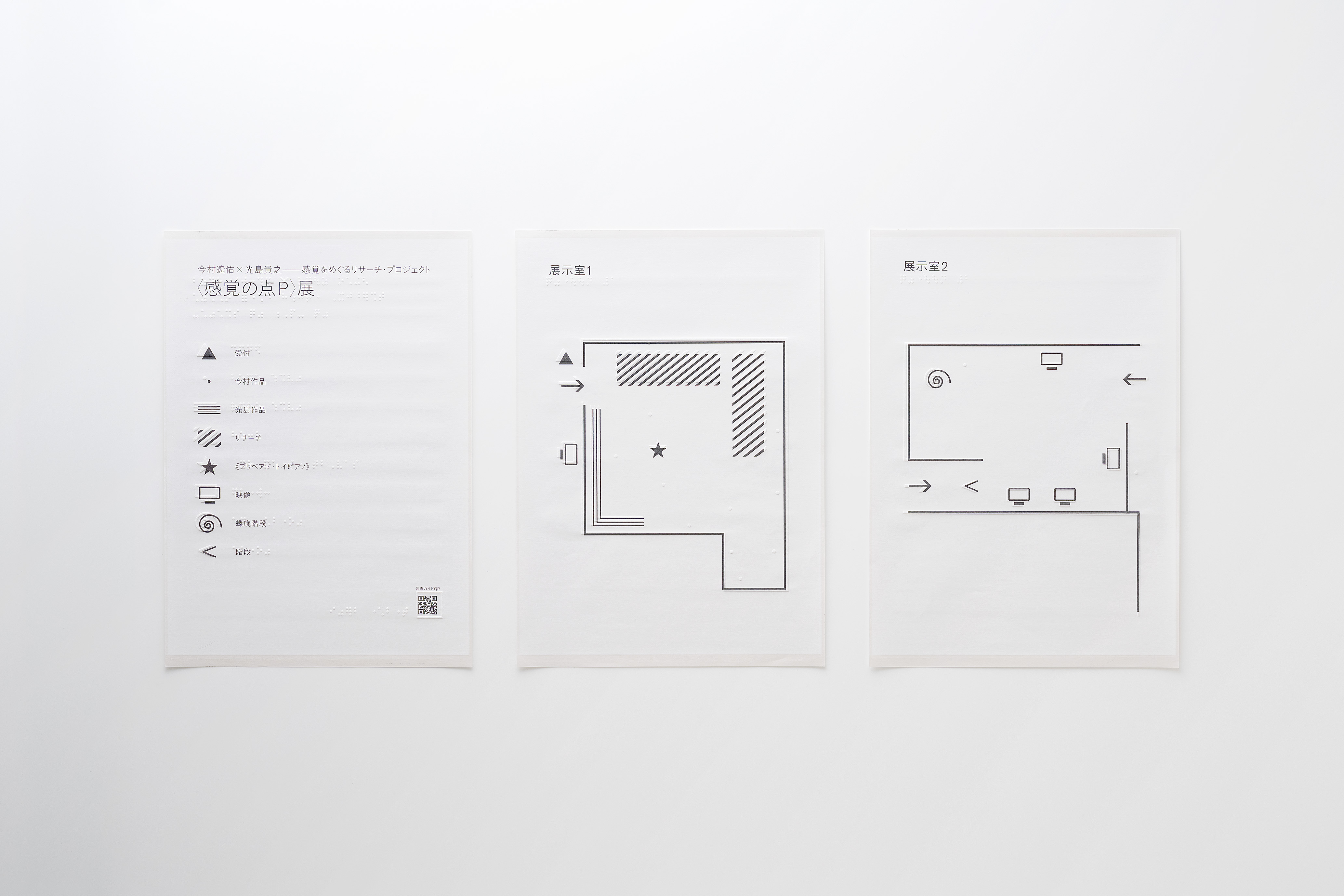 東京渋谷公園通りギャラリーでは、2025年に開催した展覧会「今村遼佑×光島貴之 感覚をめぐるリサーチプロジェクト 〈感覚の点P〉展」に関連して、展覧会における印刷物を、点字と触図付きで制作する印刷実験に取り組みました。その目的は、視覚に障害のある方へのアクセシビリティの充実を図るとともに、視覚的に伝える情報と触覚的に伝える情報とを合わせて、見える人も見えない人も一緒に楽しむことのできる展覧会の実現にあります。